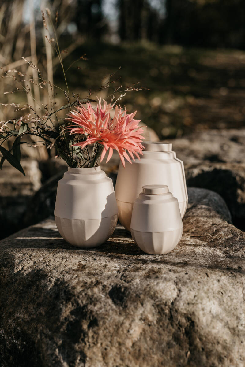 Hella Duijs heeft samen met haar compagnon Elke (naast de mini urnen) een collectie urnen gemaakt onder de naam Studio Sterrenstoff. Zoek het formaat urn uit dat bij je past en kies er een bijpassend vaasje in dezelfde kleur bij. Plaats bloemetjes in het vaasje en zoek een mooie plek uit voor de set.