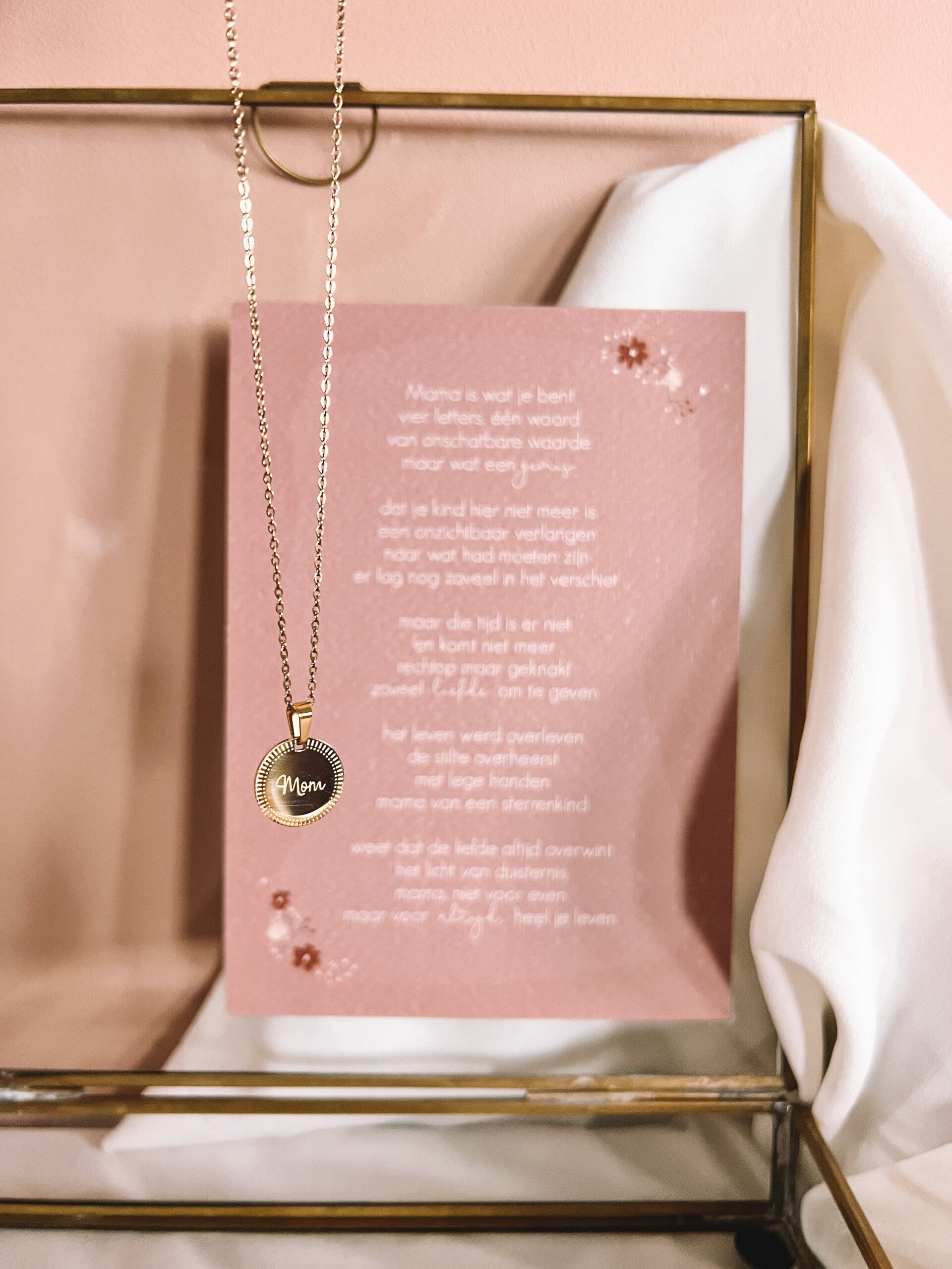 Het bestaat uit de kaart mama & ketting mom, gemaakt van RVS.
