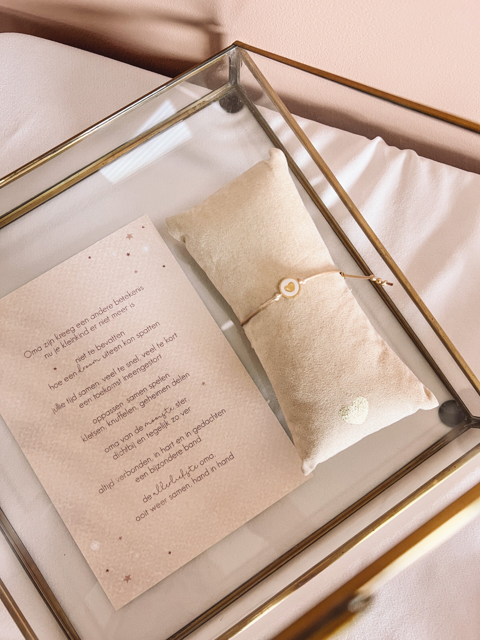 Het setje bestaat uit de kaart met het gedicht en armbandje speciaal voor oma.. Altijd verbonden 🫶🏻
