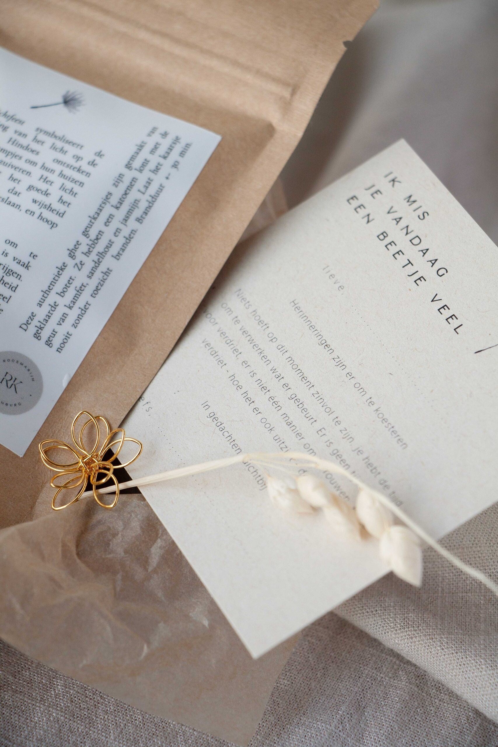 Herinneringen zijn er om te koesteren. Maar het gemis is vaak groot en moet een plekje krijgen. Ook bij het nemen van afscheid biedt dit pakketje veel troost. Brand een kaarsje op de momenten dat het gemis extra groot is en je wel een beetje warmte, licht en kracht kunt gebruiken.