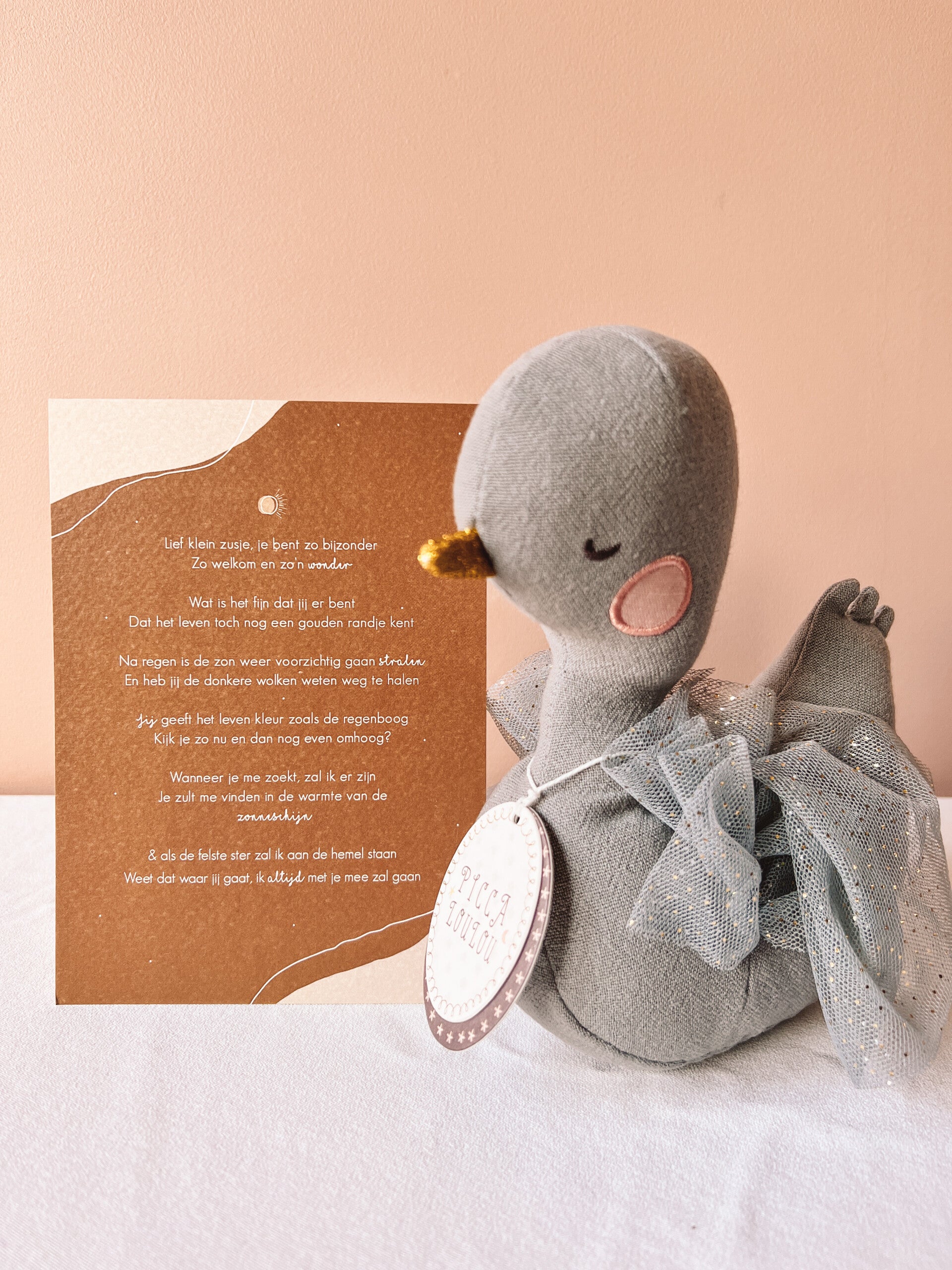 Dit pakket bevat een mooie kaart met een gedicht dat gaat over een meisje dat geboren wordt na verlies. En een lief magisch zwaantje, een knuffeltje dat ze altijd bij zich kan houden.
