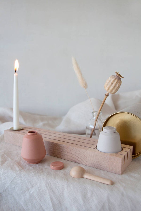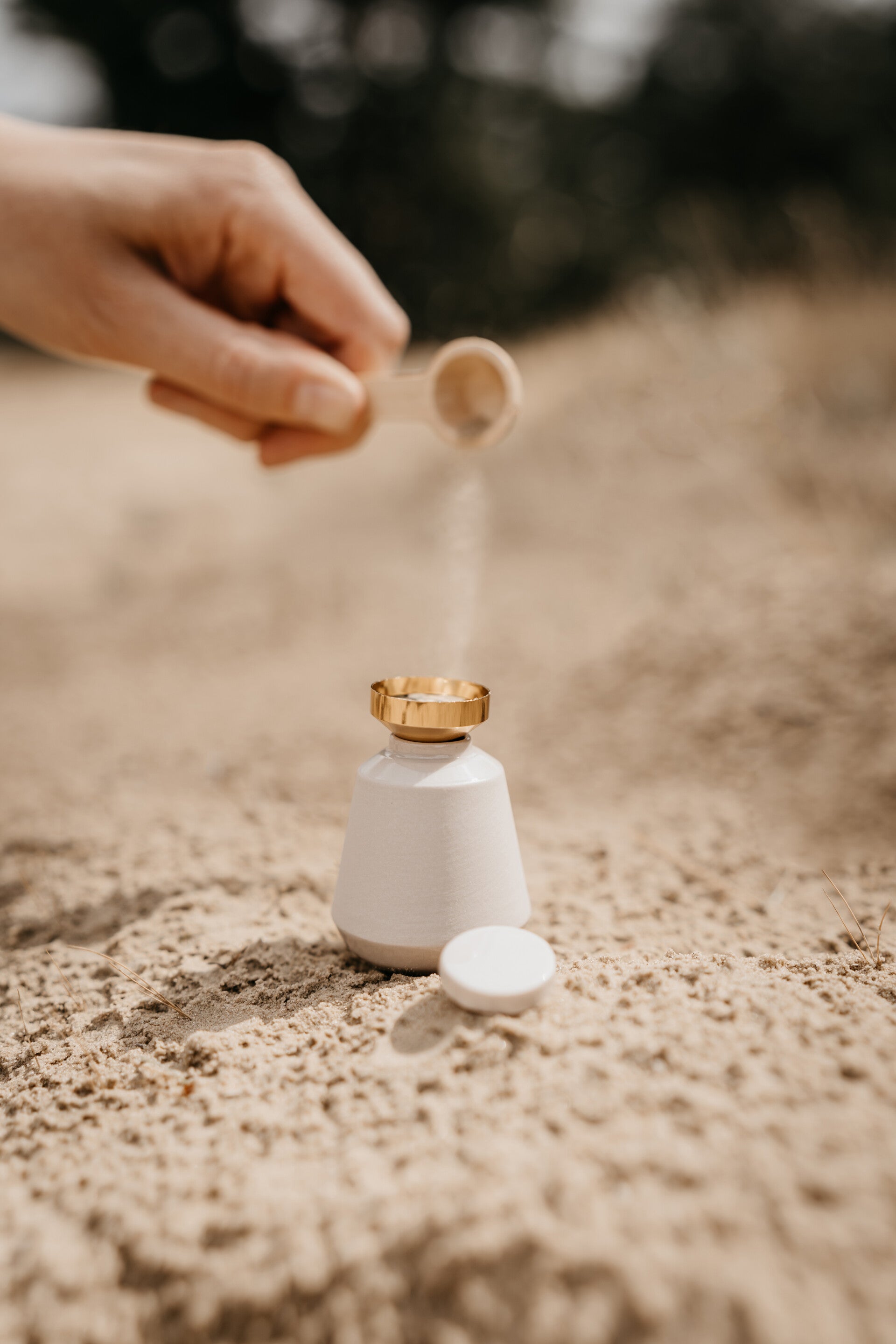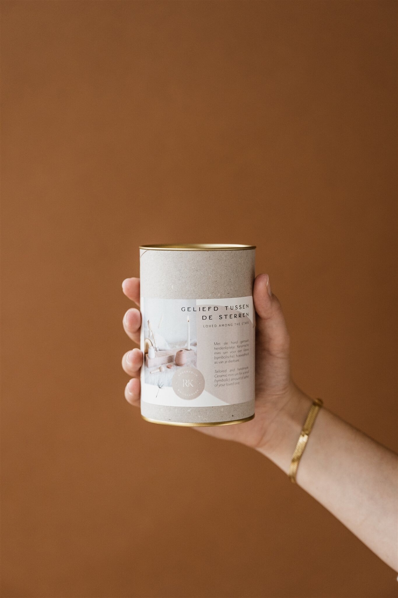 De mini urn heeft een matte uitstraling en een kleine glazuurlaag. Het is verpakt in een linnenzakje en koker met gouden accenten. Het wordt geleverd met een gouden trechtertje en een bamboo lepeltje waardoor je makkelijk het as van je kindje of het as van jouw dierbare over kunt scheppen in de mini urn.